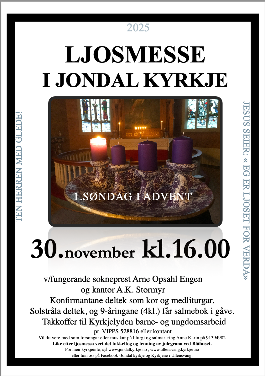 Hjarteleg velkomne til gudstenester og konsertar med meir i Jondal kyrkje no i kyrkjeåret 2025. Kva skjer? Sjå kalender og evt. plakattavle på nettsida. Sjå gjerne også Jondal kyrkje på facebook. Velkomne alle!