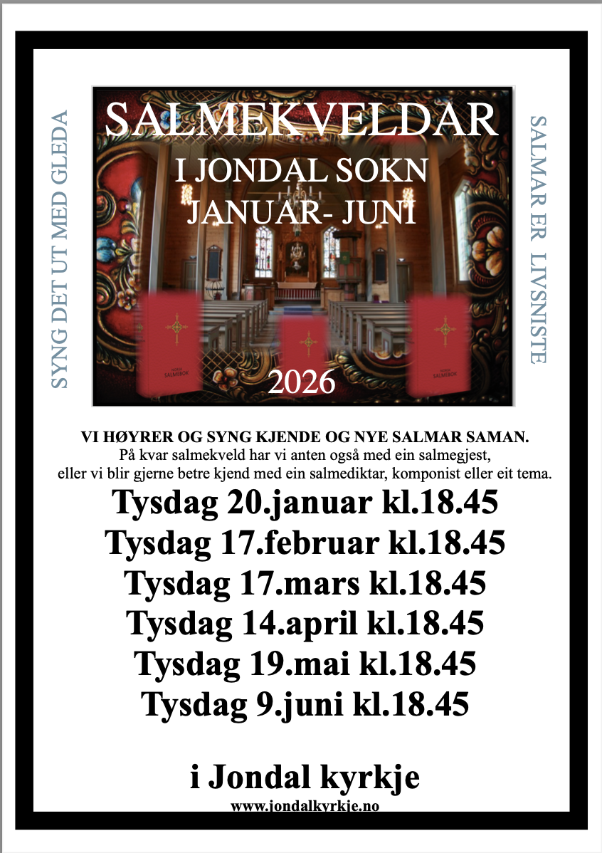 Neste salmekveld i vår vert tysdag 17/2 i Jondal kyrkje.Hjarteleg velkomne, alle! Og, BLI MED I EI SYNGANDE KYRKJE! I JONDAL SOKN SYNG VI SALMAR EIN TYSDAG I MÅNADEN. Velkomen til nye salmekveldar våren 2026.