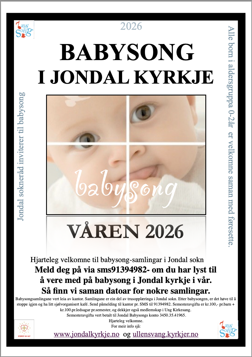 Babysongsamlingane er ein del av trusopplæringa i Jondal sokn. Vi møtest nokre torsdagar kl.12-13 denne hausten, framme i Jondal kyrkje. Etter babysongen må de gjerne vere saman vidare på "småbarnskafé" framme i kyrkja. Alle born i aldersgruppa 0-2år saman med føresette (evt. andre vaksne) er hjarteleg velkomne.