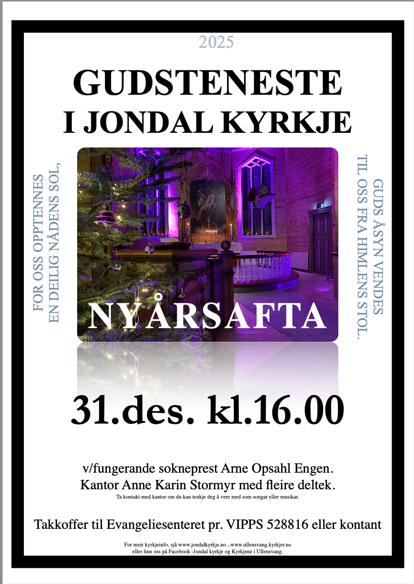 Nedanfor i denne artikkelen finn du plakatar om komande arrangement og gudstenester i Jondal sokn.