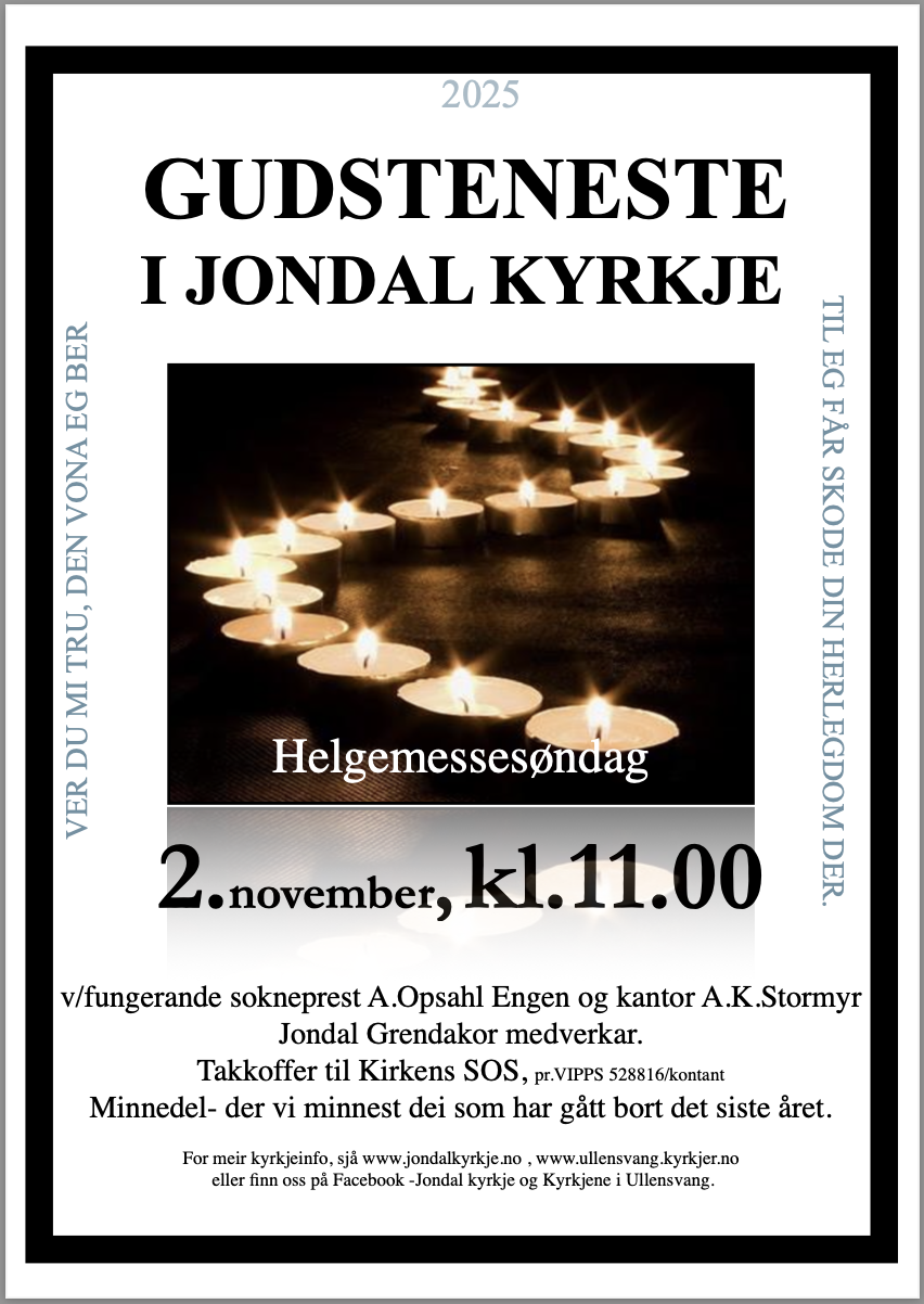 Nedanfor i denne artikkelen finn du plakatar om komande arrangement og gudstenester i Jondal sokn.