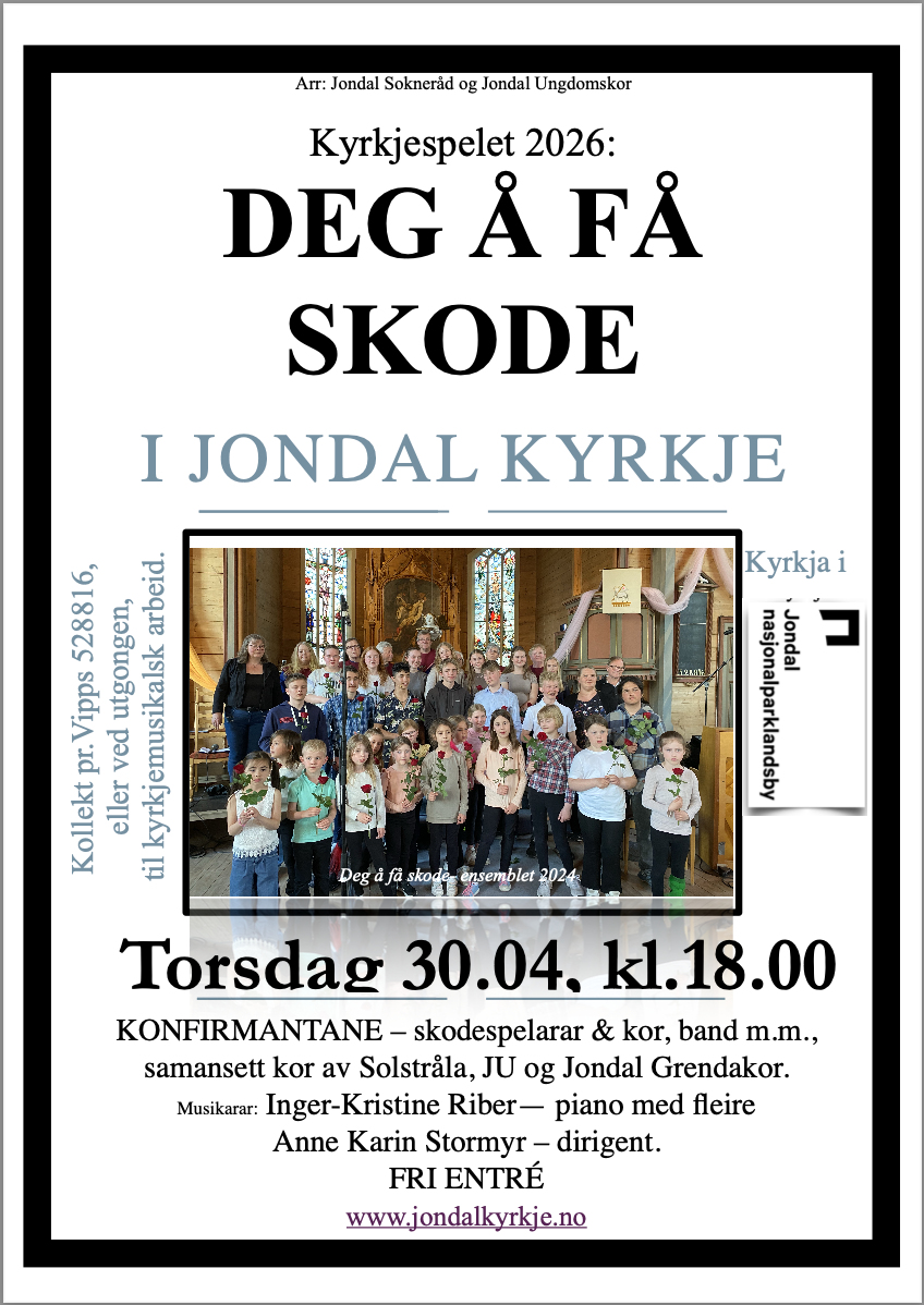 Jondal sokn og Jondal ungdomskor inviterter, og konfirmantane, Solstråla, Jondal Grendakor og musikarar tok oss med inn i spelet "Deg å få skode".