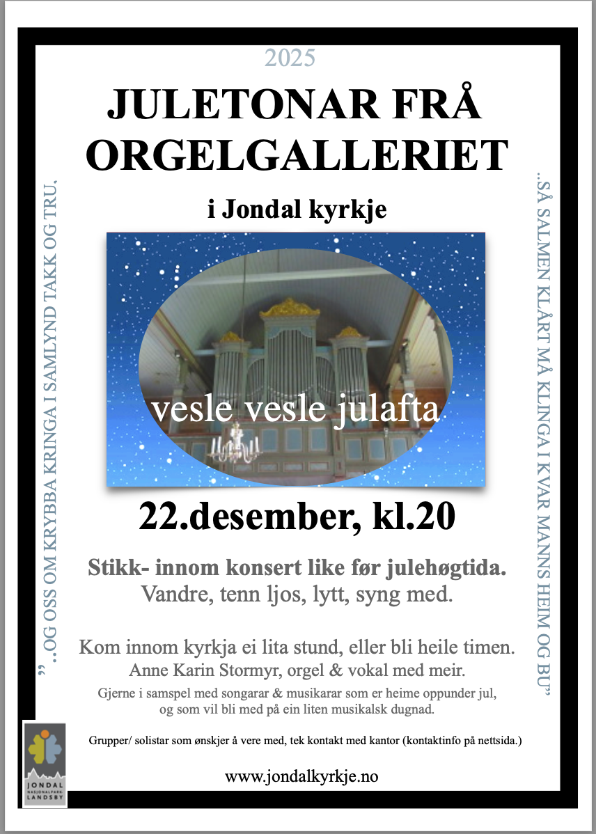 Måndag 22.desember kl.20 er du velkomen til ein "Stikk innom"-konsert i Jondal kyrkje der kantor Anne Karin Stormyr og nokre born og unge både frå JU, frå Solstråla og frå kulturskulen deltek med sine juletonar både frå orgelgalleri og kordør. Velkomne innom.