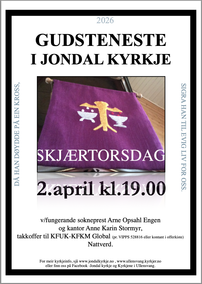 Hjarteleg velkomne til gudstenester og konsertar med meir i Jondal kyrkje no i kyrkjeåret 2025/2026. Kva skjer? Sjå kalender og evt. plakattavle på nettsida. Sjå gjerne også Jondal kyrkje på facebook. Velkomne alle!