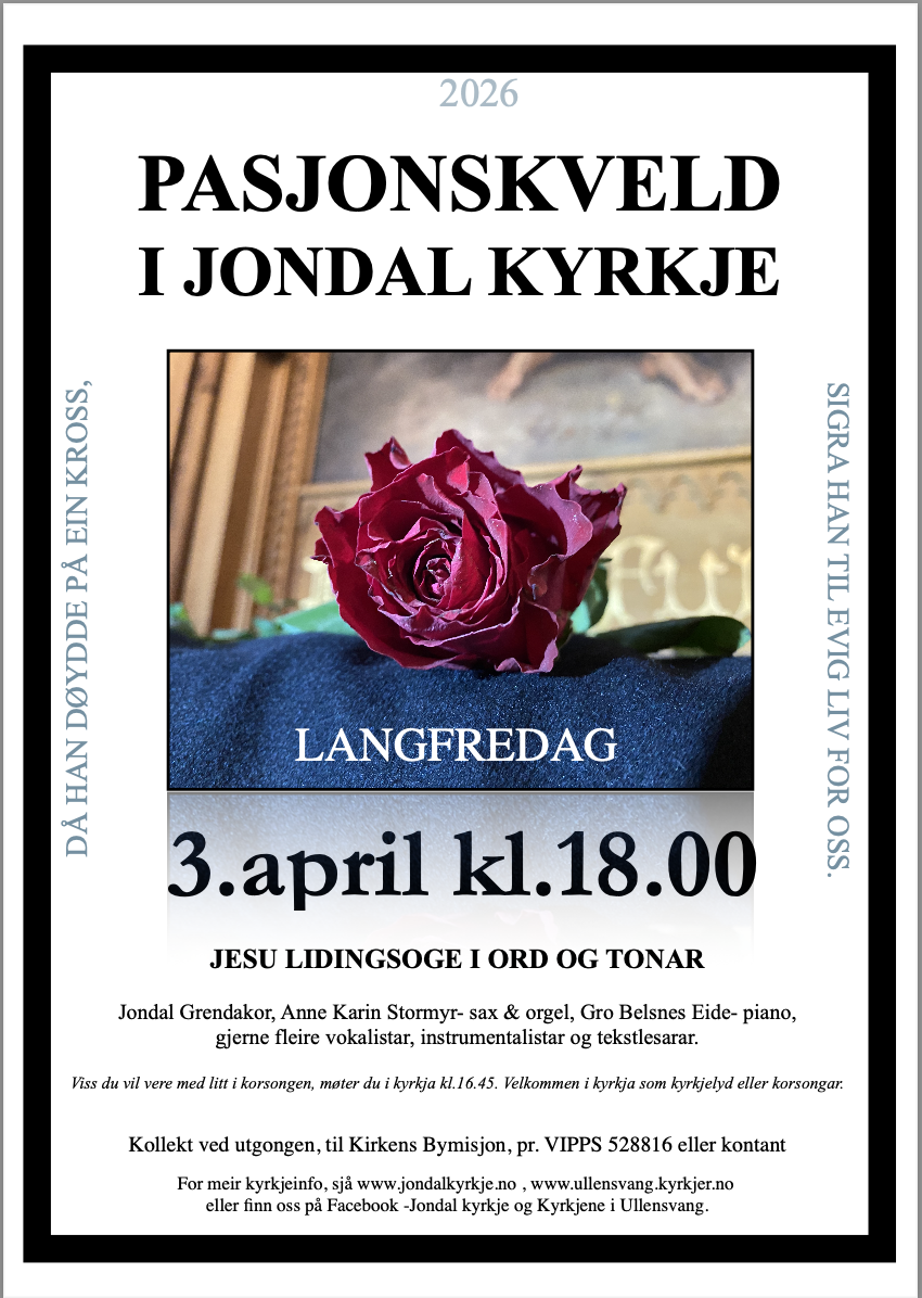 Ønskjer du vite litt meir om kva som skjer i Ullensvang kyrkjelege fellesråd eller i dei andre kyrkjelydane i Ullensvang, finn du info på fellesrådet si nettside https://ullensvang.kyrkjer.no/ og på facebooksida Kyrkjene i Ullensvang. Jondal sokn har facebooksida Jondal kyrkje.
