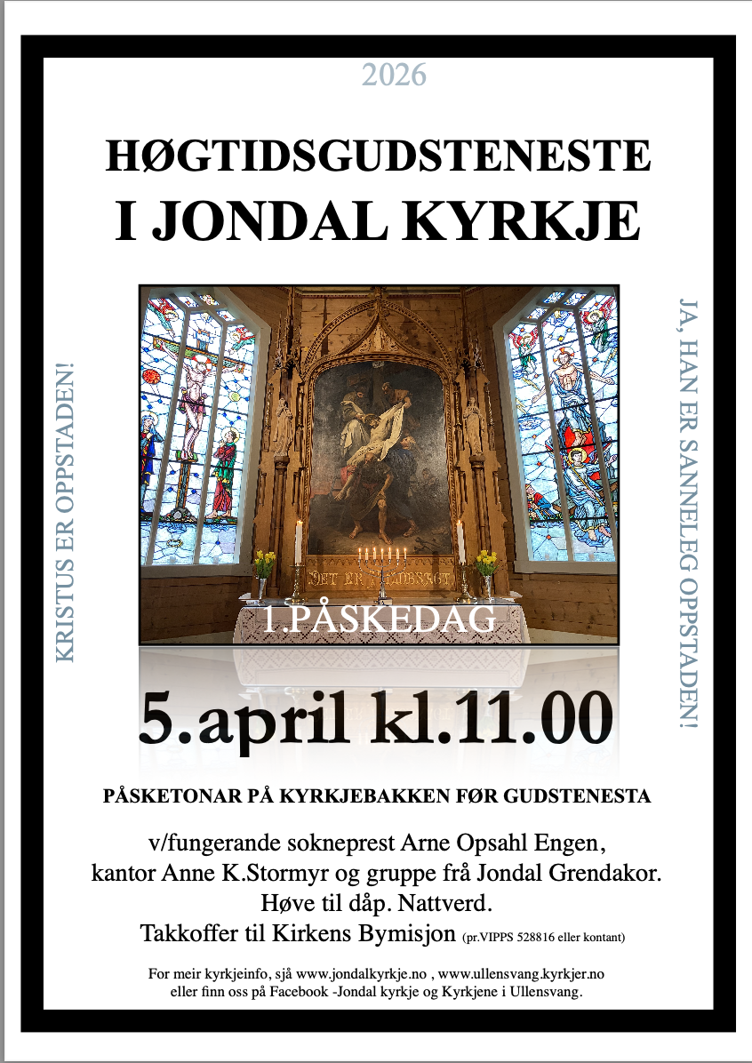 Velkomne til neste gudsteneste, og velkomne andre arrangement (sjå kalendar). Velkomne til Jondal Babysong, Jondal Grendakor og Solstråla. Klikk "les mer" for PLAKATTAVLE, direktesending og videoar med meir. Jondal kyrkje har også ei enkel facebookside som de gjerne må følgje.