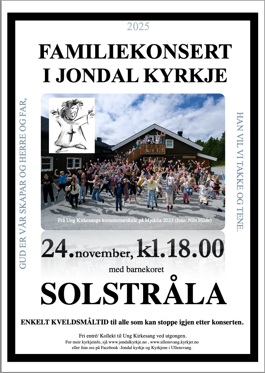 i Jondal kyrkje, måndag 24.november kl.18.00. For meir info, sjå vedlagt plakat her og på kalender. Og, velkomne til enkelt felles kveldsmåltid i kyrkja etter konseten.