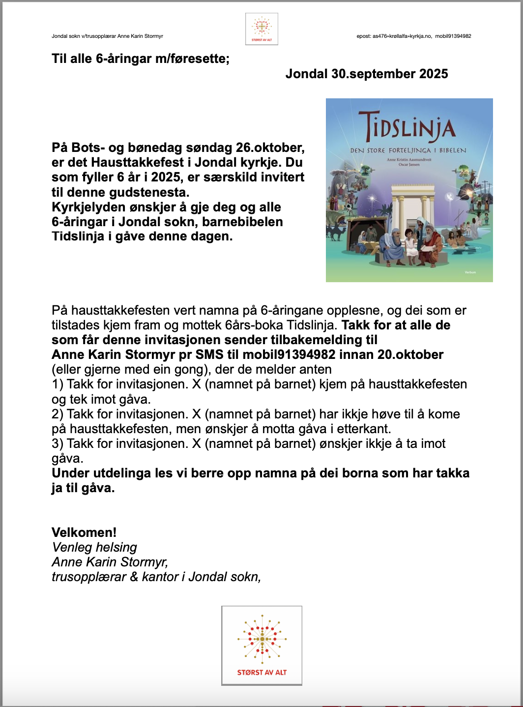 6års-boka er i Jondal sokn, frå i år, barnebibelen Tidslinja. Alle 6-åringane i Jondal sokn får 6-års boka i gåve frå Jondal sokn under utdeling på Hausttakkefesten søndag 26.oktober kl.11. Velkommen.
