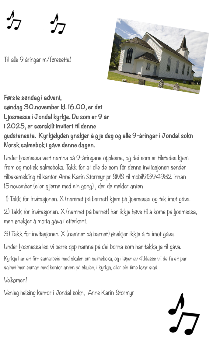 Invitasjonsbrev til alle som fyller 9 år i Jondal sokn i 2025