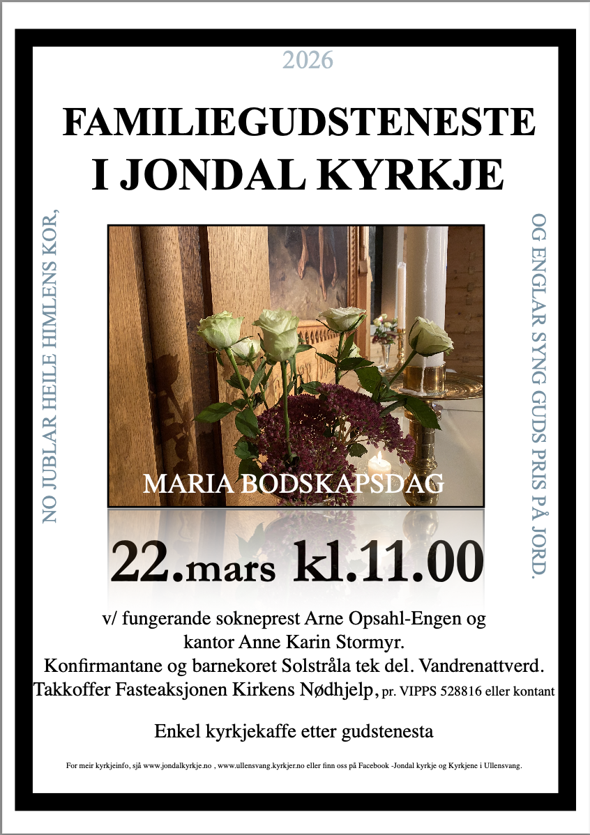 Vi feirar Maria Bodskapsdag med familiegudsteneste, og i påskehøgtida ønskjer vi velkomne til gudsteneste skjærtorsdag, pasjonskveld langfredag og høgtidsgudsteneste 1.påskedag. Ta med familie og vener og ver med og skap fest, pasjonstid og høgtid i kyrkja.